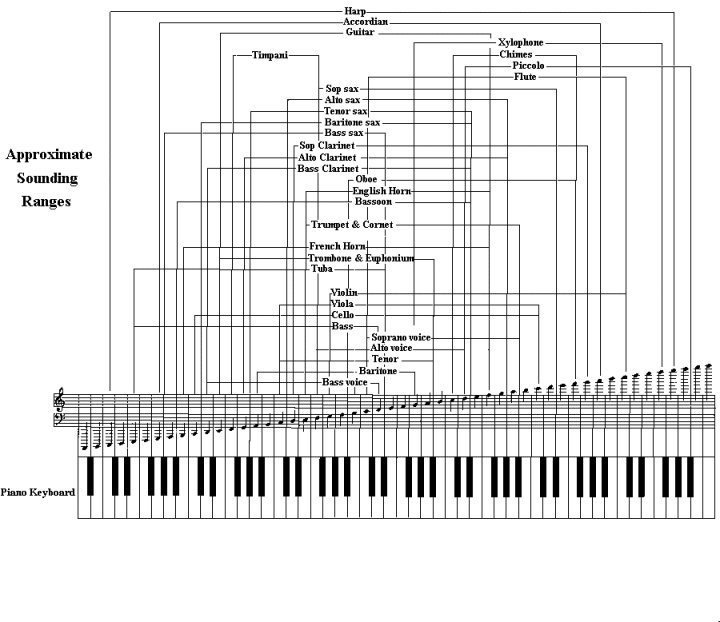 I like to give all of my students –on any of the instruments I teach: guitar, flutes, recorders, folk instruments–a couple of lessons on the piano so that the concepts of scale construction and key will be readily visible. These ideas are not very accessible on other instruments, but on the piano, they are easier. Here is a chart showing the ranges of many instruments on the full piano keyboard.