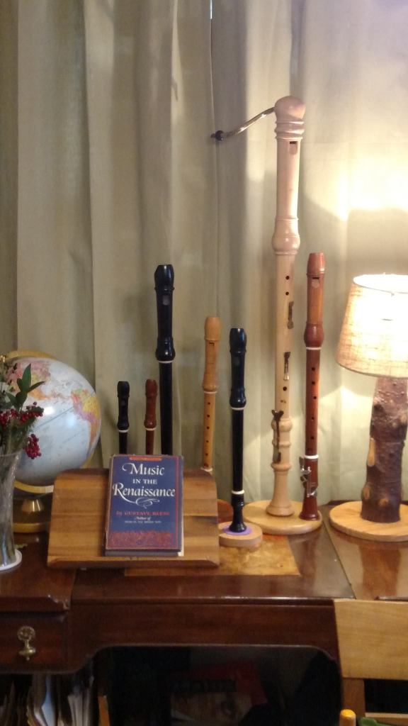 Also, I have taught flutes (C-flute, alto flute, bass flute, folk flutes), recorders, hammered dulcimer, mountain dulcimer and mandolin and keyboards–to include the piano accordion, and the Theramin, all of which I have in my studio. Here are some of my recorders, all shown are Baroque recorders made by Moeck, soprano, alto, tenor and bass. The woods represented here are pear wood, ebony, palisander, boxwood, maple and grenadilla.